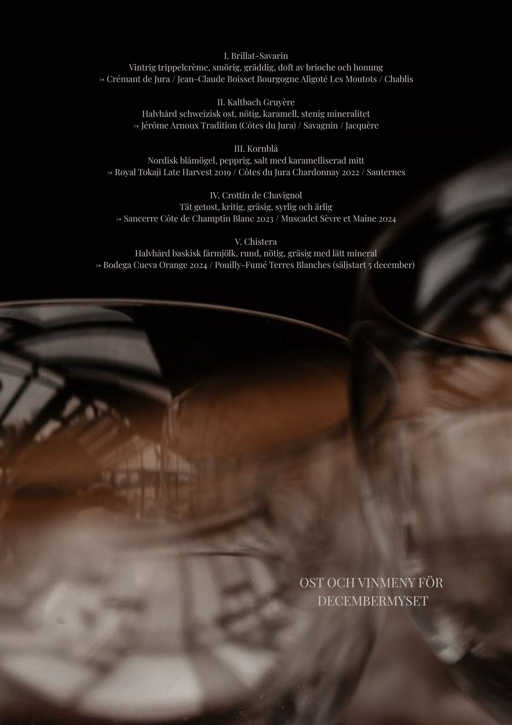 Fem ostar, fem viner, fem landskap i decembermörkret. Varje kombination berättar sin egen historia — gräddig, nötig, stram, pepprig, varm. Ost och vin är små kartor över tid och plats, små ritualer att smaka, känna och minnas. Och detta är bara några exempel, en början på vägen. Smaka, byt, lek, prova dig fram — låt dina egna favoriter dyka upp, hitta nya röster, nya harmonier. Det är i dessa stunder, dessa små pauser mitt i decemberpressen – det är här man förstår hur vin och ost kan föra oss till platser vi aldrig trott vi kunde nå — långsamma, levande, förgängliga.