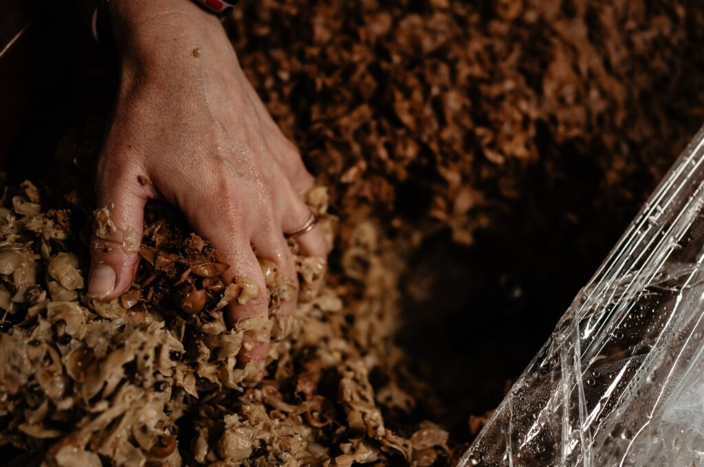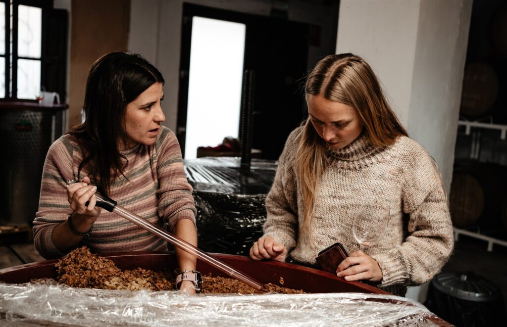Under jäsningen är vinet som mest levande. Skalen, kärnorna och fruktköttet stiger långsamt mot ytan, drivna av koldioxiden som bildas när jästen arbetar och formar en tät druvhatt. Den ligger som ett lock över musten medan det unga vinet jäser lugnt därunder. Verónica följer processen noggrant och känner temperaturen, ser hur hatten rör sig, och lyssnar på jäsningen. Det är här hon fattar några av sina viktigaste beslut. Hur och när hon arbetar med druvhatten, varsamt och utan stress, avgör hur mycket färg, tannin och struktur som förs över till vinet. Ett ögonblick där hantverk, erfarenhet och intuition möts och där vinets framtida uttryck sakta tar form.