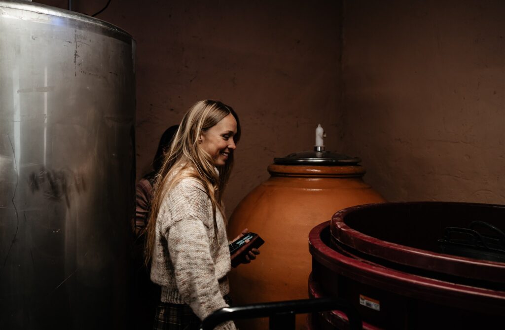 Vi smakar oss igenom de viner som är under process. I vineriet i Los Duques står vi med varsitt glas och provar tankprover av det som fortfarande jäser, fortfarande söker sin form. Tillsammans med Hanna och Eric från Casa Amytis får vi följa vinet mitt i processen, där inget ännu är bestämt men allt redan finns där. Det blir snabbt tydligt att det här inte är vin som låter sig flyttas eller översättas. Det hör hemma just här i den röda, kalkrika jorden, i höjden där dagarna bränner och nätterna svalnar, i byn som nästan löses upp i landskapet runt omkring. Tankproverna är levande och ofiltrerade, fulla av energi och riktning. De bär spår av varje beslut längs vägen – av gamla stockars djupa rötter, av händer som känner varje rad i vingården, varje nyans i jord och ljus. Och av en passion som inte höjer rösten men som finns i varje moment – i tålamodet, i nyfikenheten, i viljan att förstå snarare än att kontrollera.